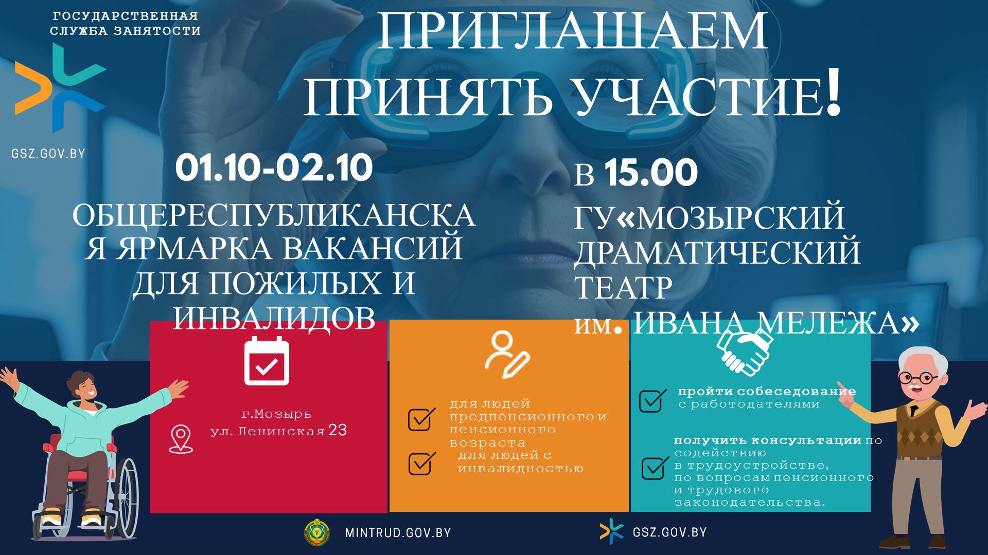 Для поддержки инвалидов и людей старшего поколения, повышения их социальной активности и оказания содействия в трудоустройстве всем желающим, управление по труду, занятости и социальной защите Мозырского райисполкома проводит республиканскую ярмарку вакансий для граждан “серебряного” (предпенсионного и пенсионного) возраста и инвалидов, имеющих профессиональные трудовые рекомендации. Мероприятие состоится в ГУ “Мозырский драматический театр имени Ивана Мележа” 1-2 октября 2025 года. Время проведения с 15.00 до 17.00