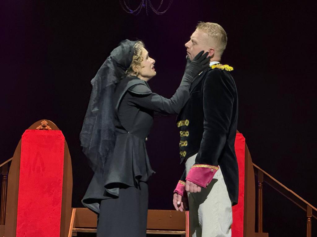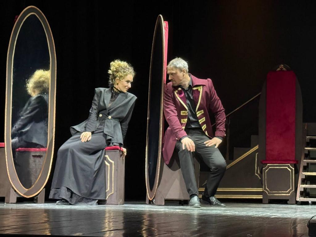 Спектакль в красно-черных тонах, полных драматизма, мерцание старинной люстры со свечами, высокие многофункциональные стулья-зеркала, кафтаны, кители, сюртуки и шляпки, казалось, должны повествовать о благородстве XIX века, но «Маскарад» Светланы Джелиевой показал нам обратную сторону человеческой души, которая не меняется на протяжении веков, и представил нам историю на грани абсурда, прикрытую масками.