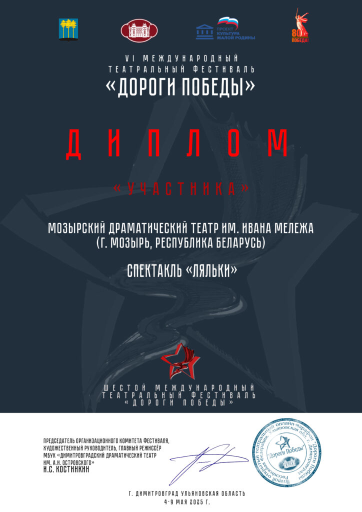 Uncategorized Поздравляем с наградой! Актеры удостоены диплома в VI Международном театральном фестивале «Дороги Победы» за спектакль «Ляльки», режиссер Юрий Вутто Подробнее 31 мая, 2025